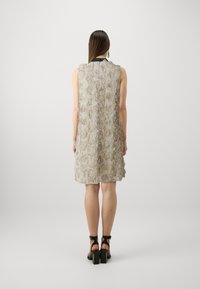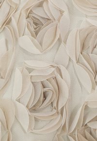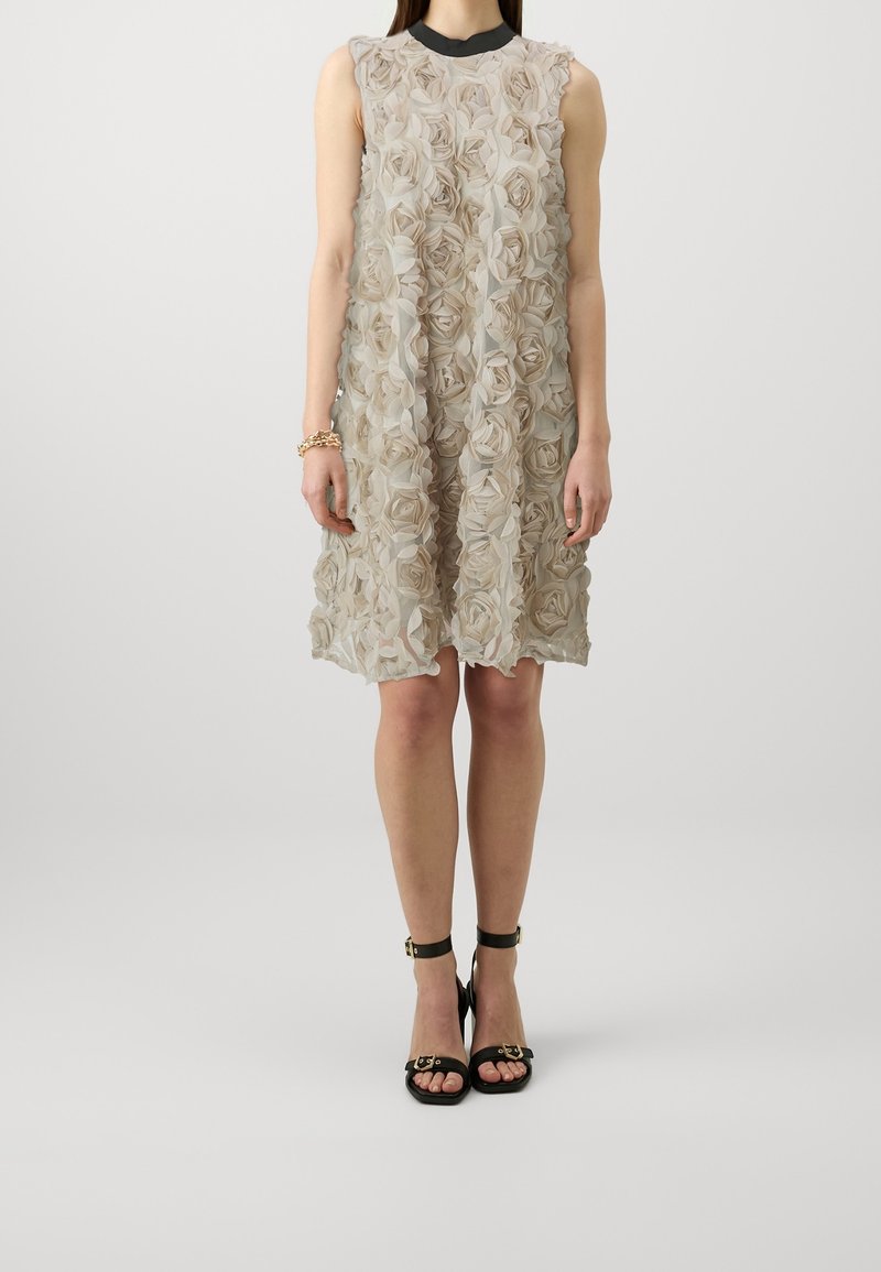 Robe sans manches beige clair avec une texture florale en relief. Ourlet plat avec un bord festonné, associée à des talons noirs à bride cheville.