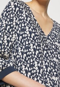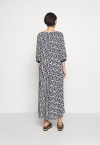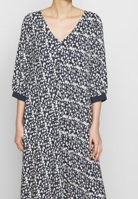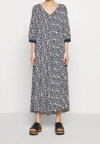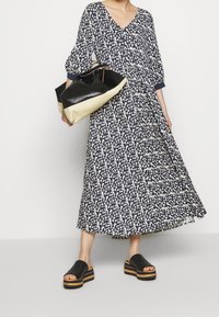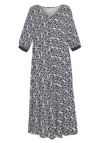 Robe maxi florale bleu marine avec décolleté en V, manches trois-quarts et motifs blancs ; associée à des sandales à plateforme noires avec des accents en bois.