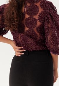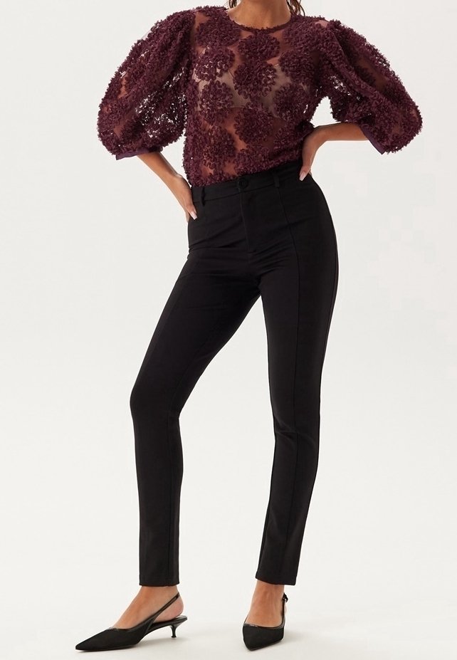 Femme portant un haut transparent en dentelle florale bordeaux à manches bouffantes, un pantalon noir ajusté taille haute et des escarpins slingback à petit talon noirs.