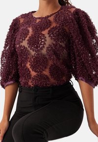Haut en sequins bourgogne avec des manches trois-quarts transparentes porté avec un jeans noir, montrant le torse supérieur et les bras de la personne.