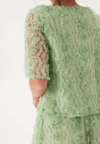 Haut vert menthe avec un motif floral texturé et des applications de roses en relief. Manches courtes et encolure bateau complètent le design.