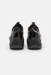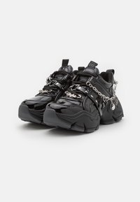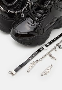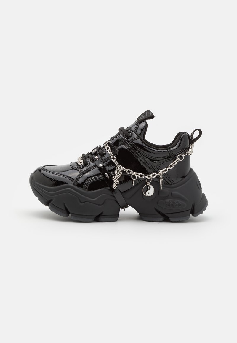 Baskets noires épaisses avec une finition brillante en cuir verni, ornées d'un accent chaîne et d'un pendentif yin-yang, ainsi qu'une semelle en caoutchouc épaisse et texturée.