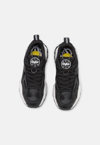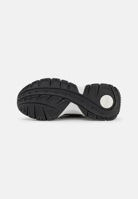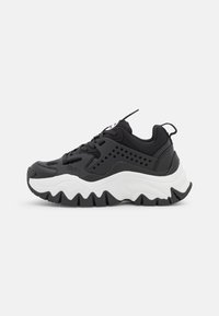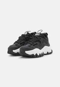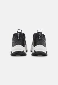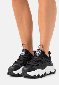 Baskets Buffalo noir et blanc avec semelles épaisses et dentelées portées pieds nus sur un fond uni.