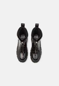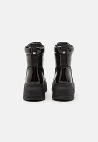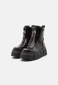 Bottine en cuir verni noir avec une semelle épaisse, fermeture éclair et languette. Présente des détails cousus et une plateforme texturée.