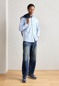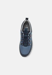 Baskets décontractées bleu et marine avec semelle blanche, œillets en métal, tige en tissu et languette de tirage au talon, montrées de profil sur un fond blanc.