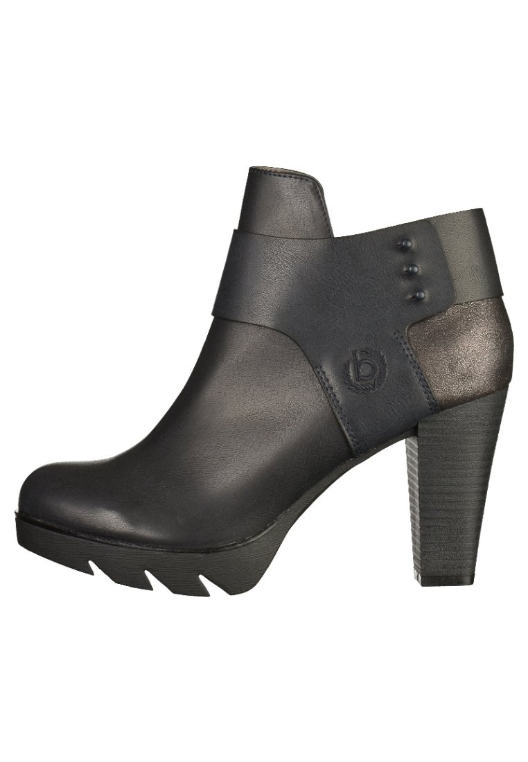 Bottine noire en cuir avec un petit talon, dotée d'un accent métallique texturé à l'arrière et de panneaux latéraux élastiques pour un enfilage facile.
