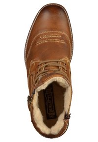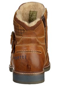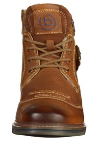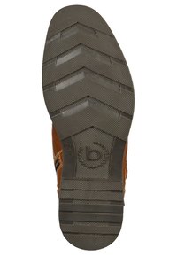 Bottine en cuir marron avec un accent texturé marron à motif, détail boucle en métal et logo sur le côté. Design à lacets.