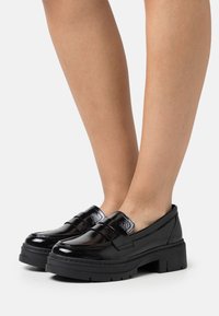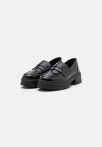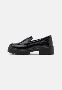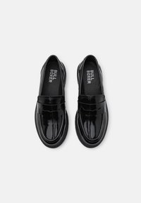 Mocassins en cuir verni noir avec une semelle plateforme épaisse, présentant des accents texturés et un design sans lacets. Fini lisse et construction robuste.