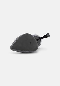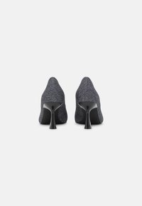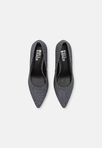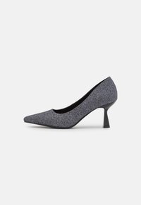 Escarpins à talons hauts gris pailletés avec un bout pointu, un empeigne basse et un talon noir brillant et fin. Texture lisse et finition scintillante.
