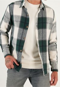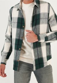 Homme portant une chemise à carreaux verte et beige boutonnée sur un T-shirt blanc, avec un jean bleu, debout devant un fond blanc uni.