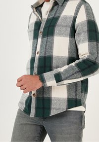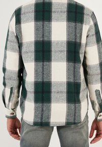Chemise à carreaux verts en tissu tissé, dotée d'un col pointu, de manches longues, d'une fermeture à boutons, et d'une poche poitrine avec un écusson logo.
