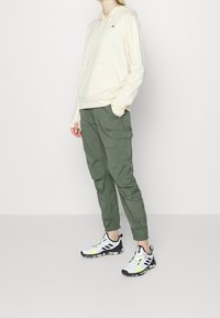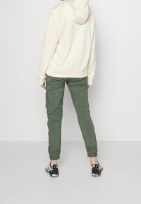 Personne portant un sweat à capuche de couleur crème avec une poche avant et des cordons de serrage, associé à un pantalon cargo vert olive.
