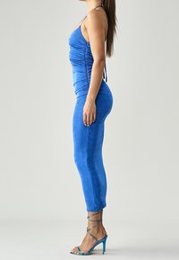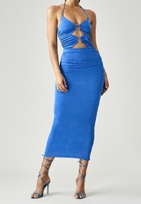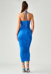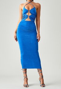 Robe midi bleue avec un décolleté dos-nu, un design froncé, des découpes en forme de goutte et une coupe cintrée. Tissu lisse et extensible avec une finition minimaliste.