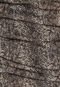 Robe asymétrique à une épaule avec un imprimé serpent brun et crème, présentant un corps texturé et un détail froncé sur le côté. Accent avec une manche longue transparente.