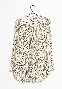 Blouse légère en crème avec des rayures noires ondulées. Dotée d'un décolleté en V, de manches longues et d'un ourlet incurvé. Accrochée à un crochet noir.
