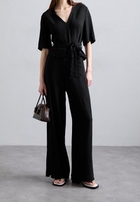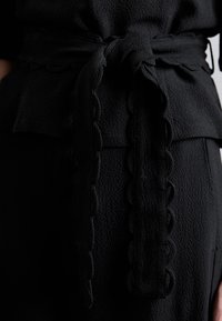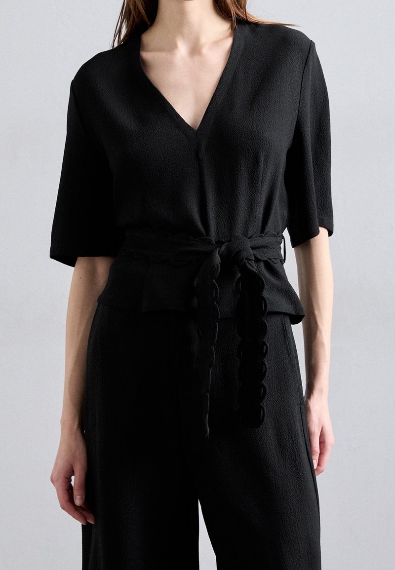 Haut noir à manches courtes avec un col en V, en tissu texturé, et une ceinture nouée avec des bords festonnés. Associé à un pantalon large noir.