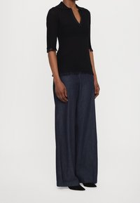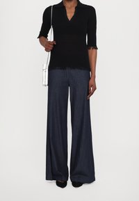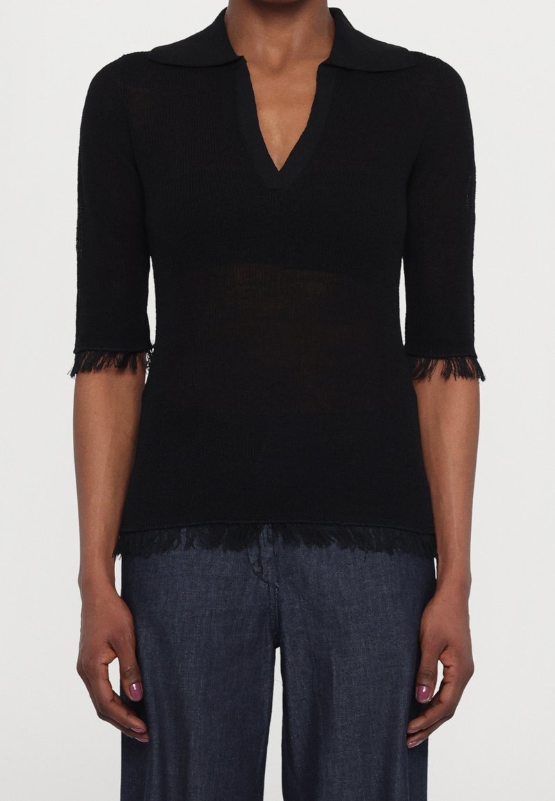 Haut noir à manches courtes avec col et bords frangés porté avec un jean denim bleu foncé, visible du cou aux hanches.