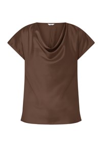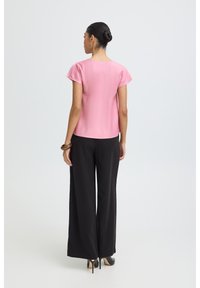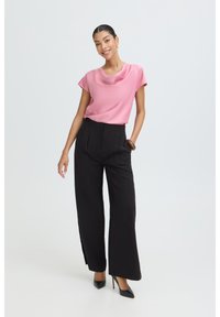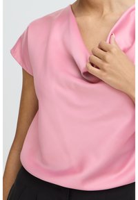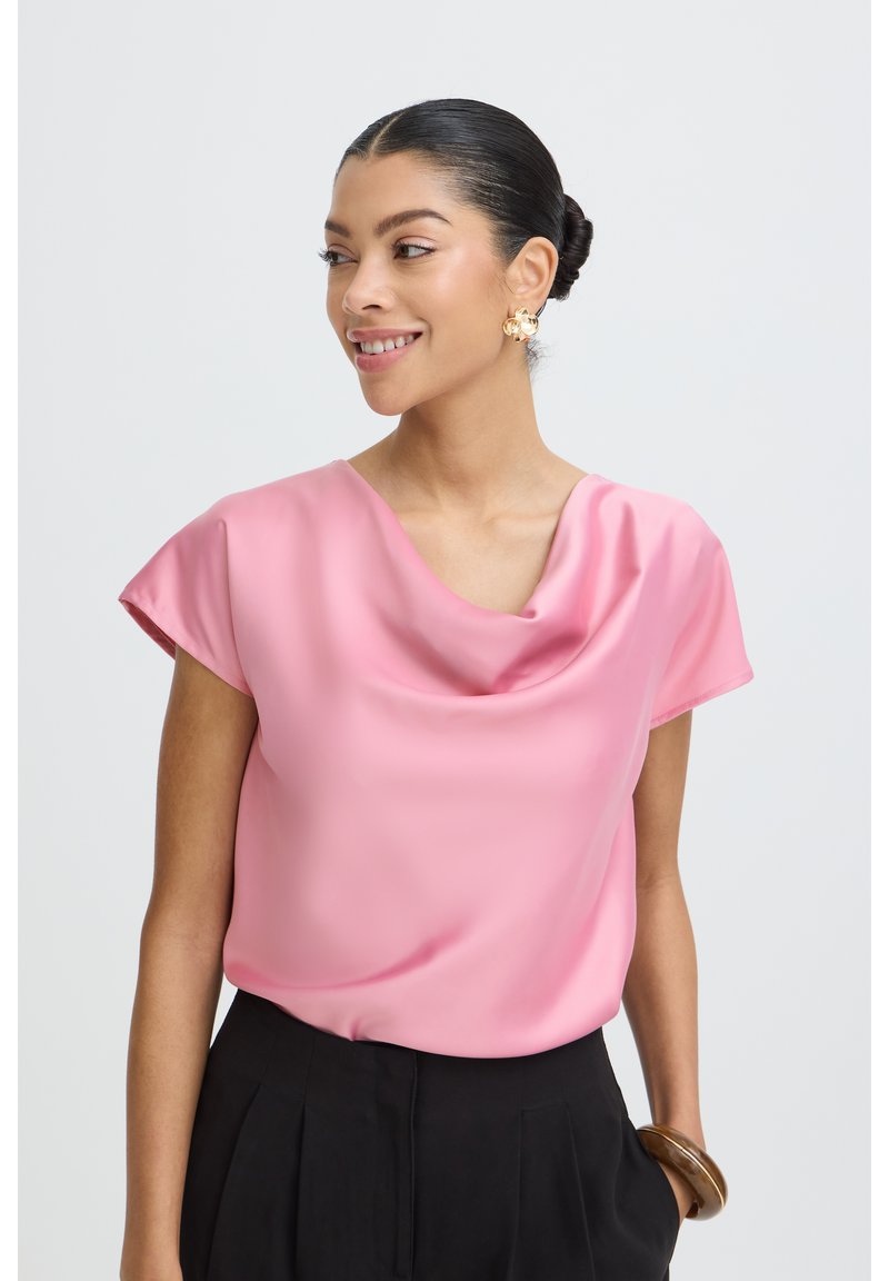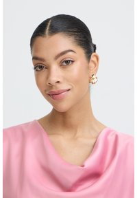 Femme aux cheveux foncés attachés en chignon, portant un chemisier en satin rose, un pantalon noir, de grandes boucles d'oreilles dorées et un bracelet épais en or, souriante et regardant sur le côté.