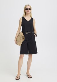 Femme blonde portant des boucles d'oreilles en or, un haut noir sans manches et un short noir jusqu'aux genoux, debout devant un fond clair uni.