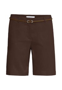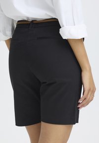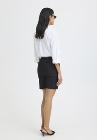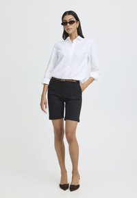 Femme portant un short noir cintré mi-long avec une ceinture marron, un chemisier blanc aux manches retroussées et des escarpins slingback pointus marron foncé.