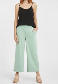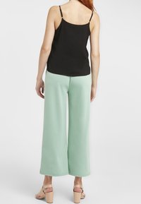 Femme portant un haut sans manches noir et un pantalon vert clair, une main dans la poche, sur un fond uni.