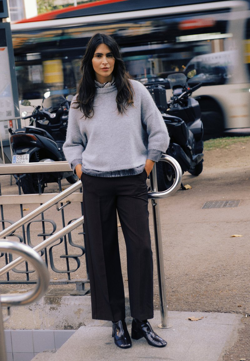 Pull gris en maille avec col montant, pantalon large marron, et bottines noires. Texture lisse et design minimaliste.