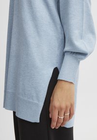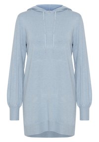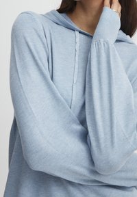 Femme portant un pull à capuche bleu clair à manches longues avec cordons de serrage, poignets et ourlet côtelés, une main dans la poche, sur un fond uni.