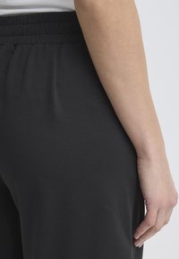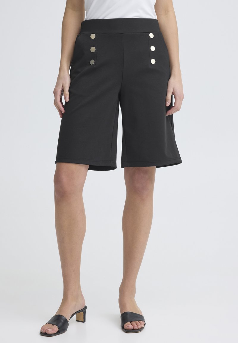 Femme portant un short noir taille haute longueur genou avec six boutons métalliques et des sandales à talons ouvertes noires.