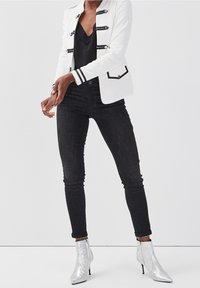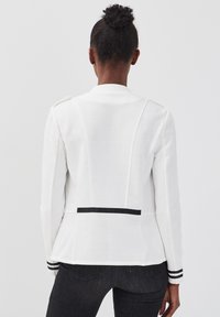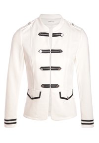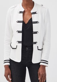 Veste de style militaire blanche avec des accents noirs, un col montant, des boutons à l'avant et des bandes contrastantes sur les poignets.