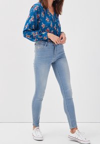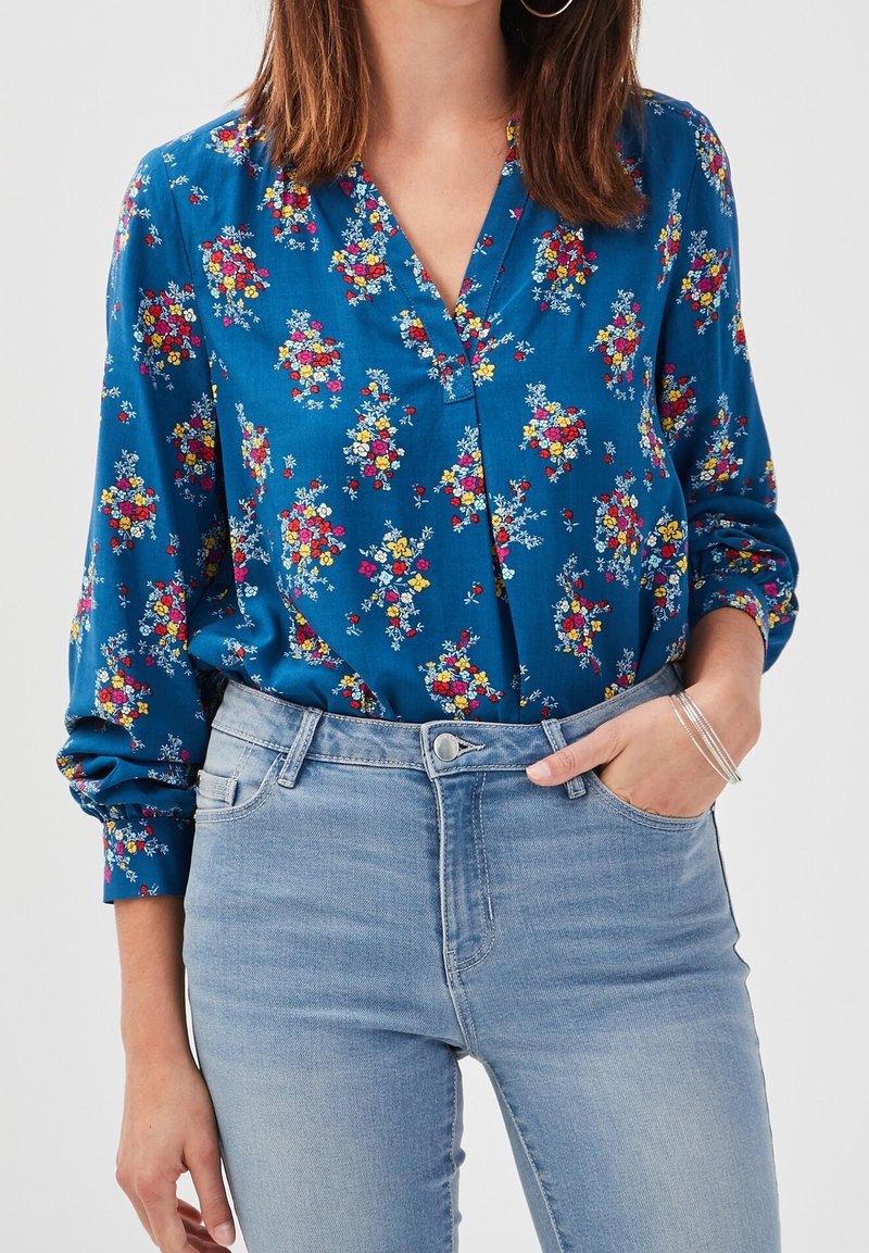 Femme portant un chemisier bleu à fleurs à manches longues, rentré dans un jean taille haute bleu clair, la main dans la poche et des bracelets argentés au poignet.
