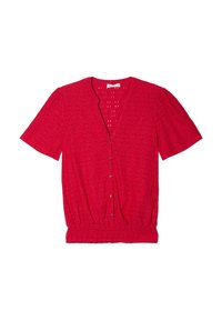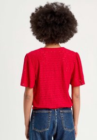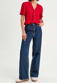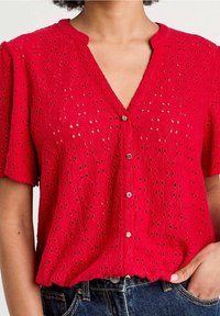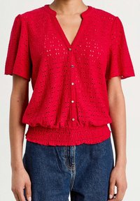 Blouse rouge à manches courtes avec boutons, motif ajouré et taille smockée, portée avec un jean en denim bleu.