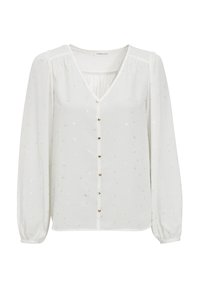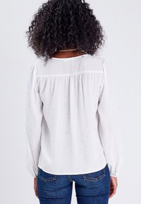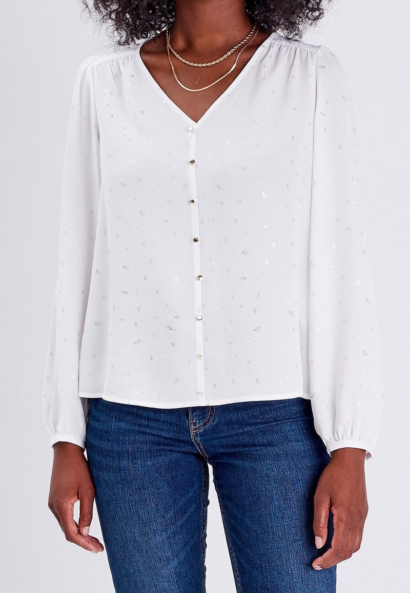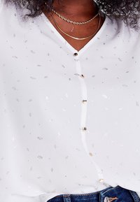 Femme portant un chemisier blanc à manches longues avec des motifs argentés subtils et un jean bleu, accessoirisée avec deux colliers en or.