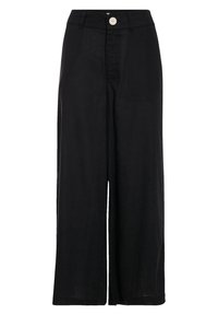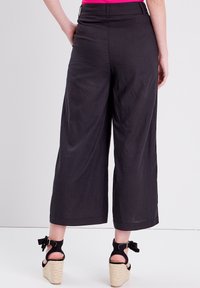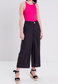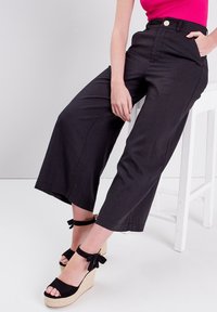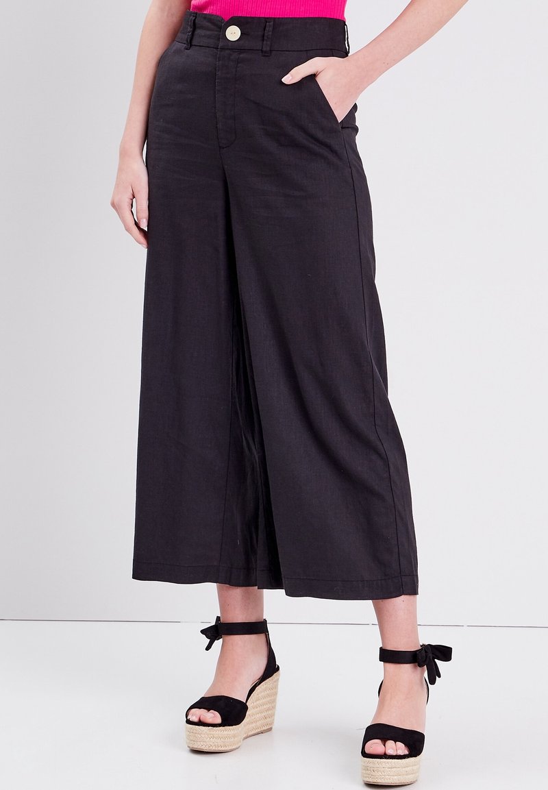 Femme portant un pantalon noir court, taille haute, jambes larges avec poches avant, et des sandales noires à plateforme avec brides à la cheville.