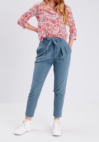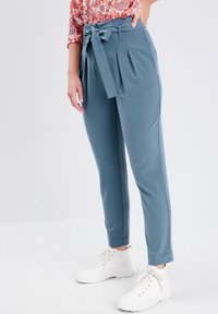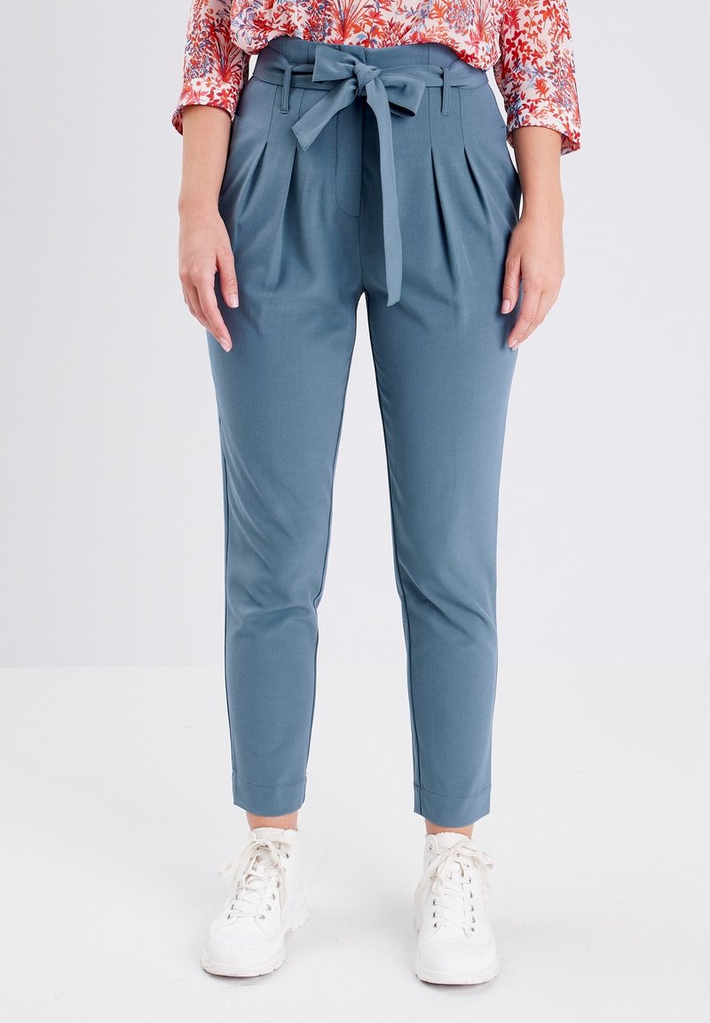 Pantalon plissé bleu clair taille haute avec un nœud à la taille, coupe fuselée et texture lisse. Porté avec des baskets blanches.