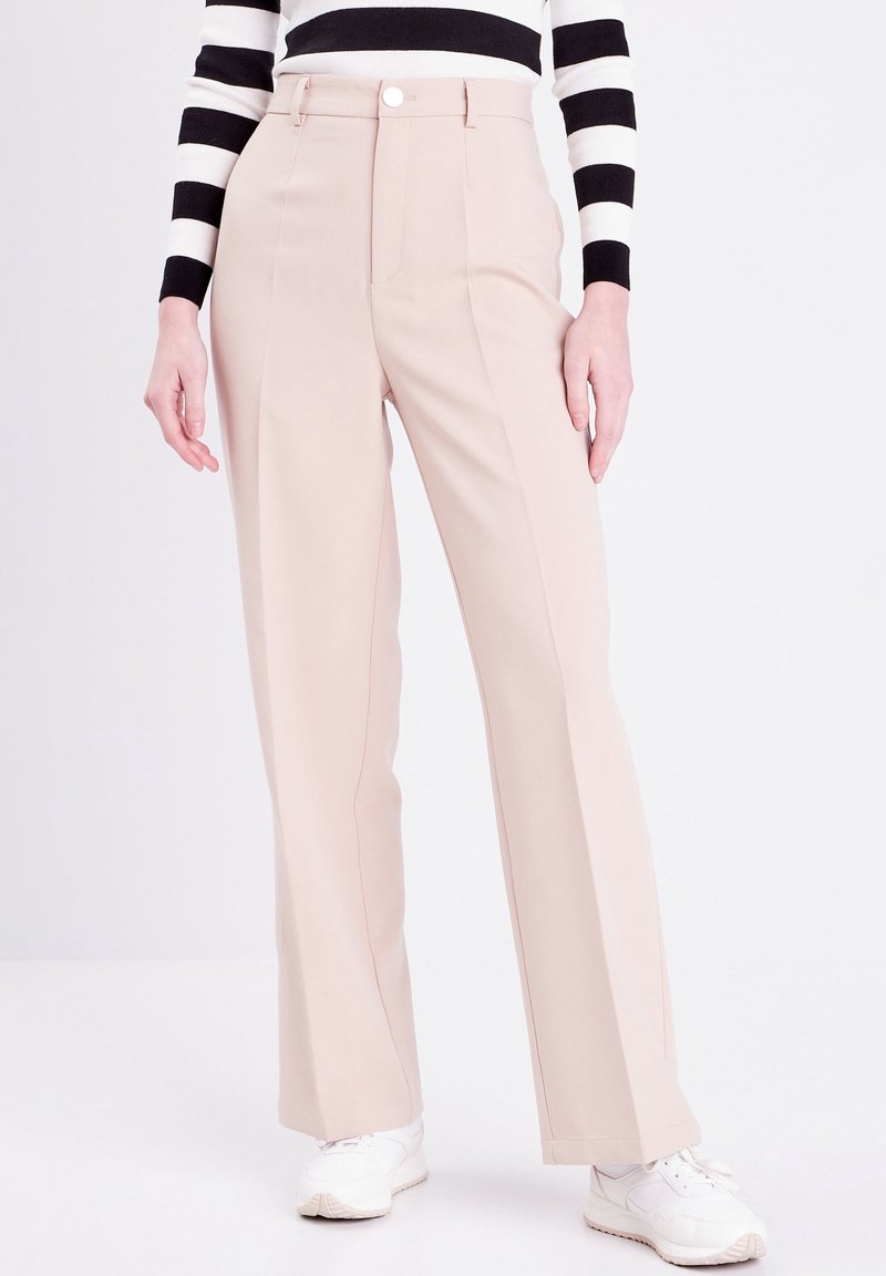 Pantalon beige à jambes larges avec une taille haute, des plis devant et une fermeture par bouton. Fabriqué en tissu lisse. Porté avec un haut rayé noir et blanc.