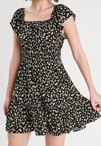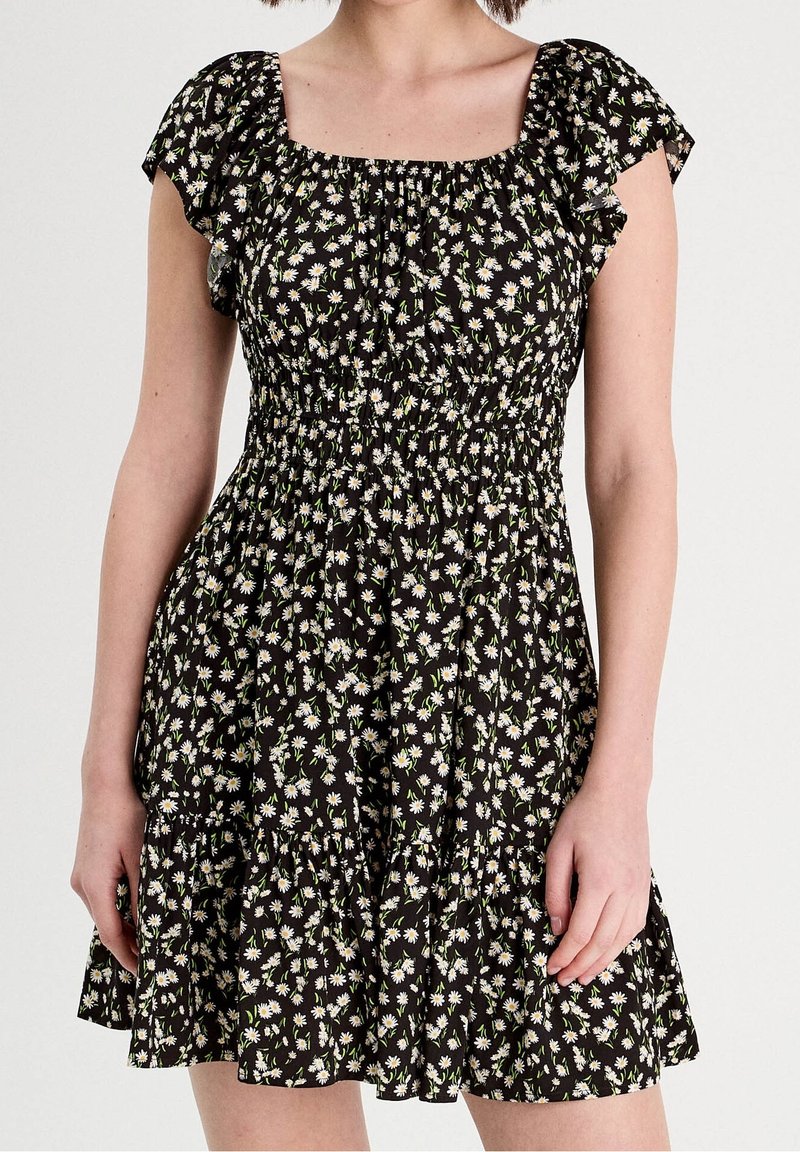 Femme portant une courte robe noire avec un motif floral de marguerites blanches et jaunes et des manches courtes volantées, debout devant un fond uni.