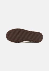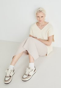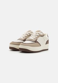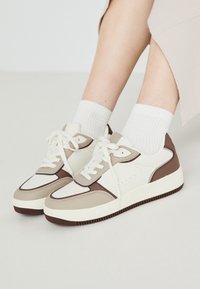 Baskets avec une semelle blanche épaisse, tige en cuir crème et marron, avec des perforations sur l'avant et des détails de panneaux contrastants.