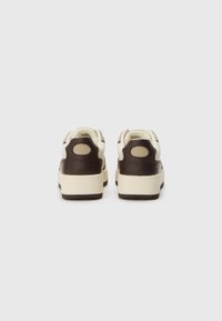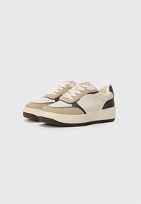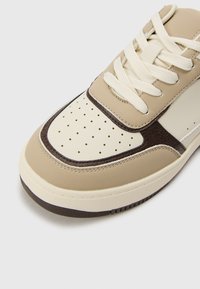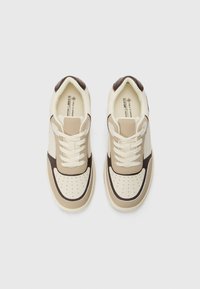 Baskets basses avec panneaux beige, crème et marron foncé, lacets blancs, perforations sur la pointe et le côté, et semelle épaisse crème avec semelle extérieure marron foncé.