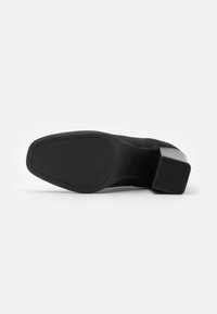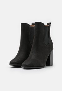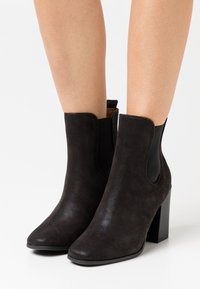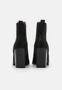 Bottines noires en daim, avec un bout pointu, des panneaux latéraux élastiques et un talon épais carré. Texture lisse et design minimaliste.