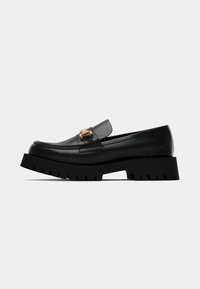 Mocassin en cuir noir avec une semelle en caoutchouc épaisse, doté d'une boucle dorée sur le dessus et de coutures décoratives le long des bords.