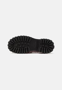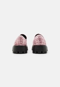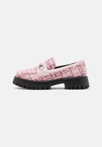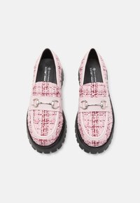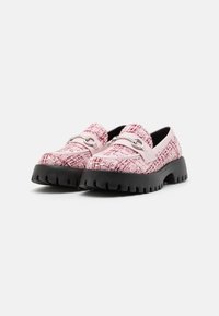 Mocassins en tweed rose et rouge avec une finition texturée, un bout rectangulaire et une semelle noire en caoutchouc épaisse. Quincaillerie argentée en accent.