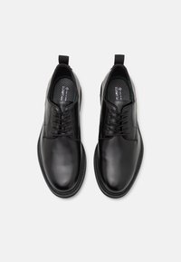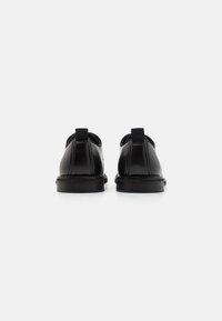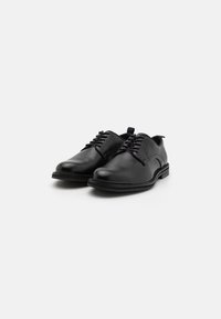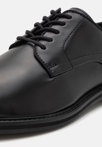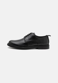 Chaussure habillée en cuir noir à finition lisse, bout rond, design à lacets et talon bas et robuste. Détail de couture simple le long de la tige.