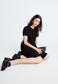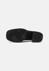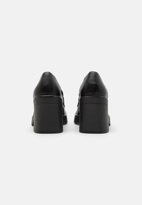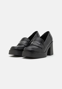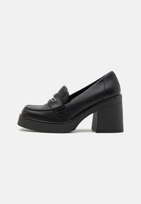 Mocassins à plateforme en cuir noir avec bout arrondi, couture décorative et talon épais. Texture lisse et design minimaliste.