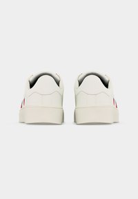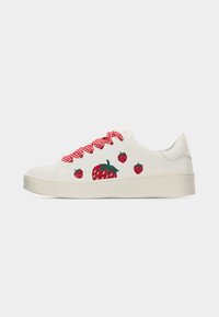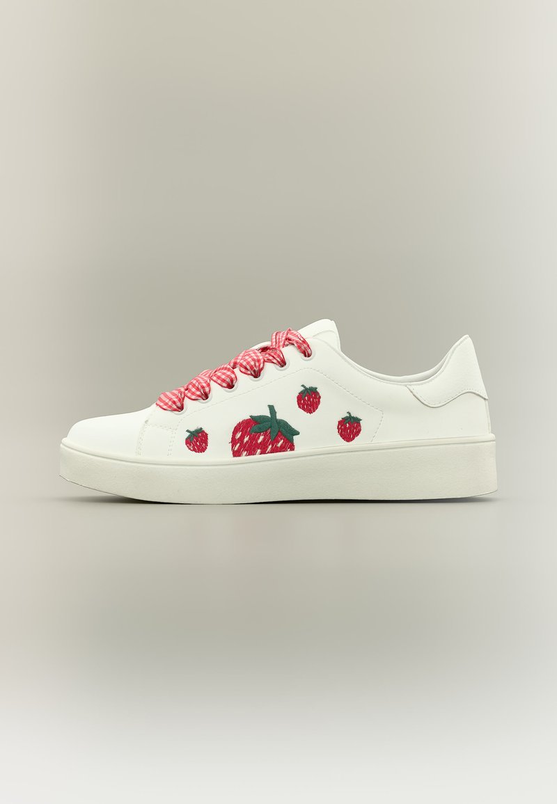 Baskets blanches avec lacets à carreaux rouges et fraises rouges brodées sur le côté, présentées de profil sur un fond neutre.