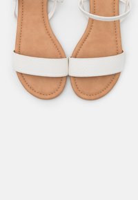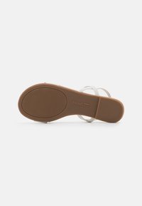 Sandales plates blanches avec des fines lanières, un dessus texturé et une semelle en caoutchouc naturel, conçues pour le confort et une utilisation facile.