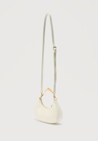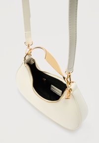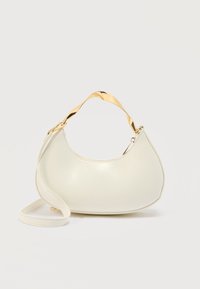 Sac à main crème en forme de croissant avec poignée courte brillante dorée et bandoulière longue assortie sur un fond clair uni.
