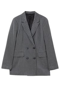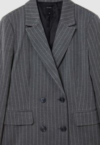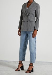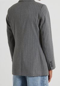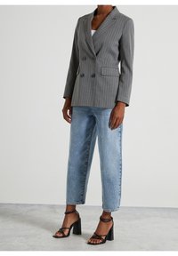 Femme portant un blazer gris à rayures fines à double boutonnage avec des revers crantés et des poches à rabat, associée à un jean bleu clair et un haut blanc.