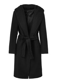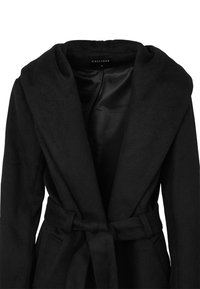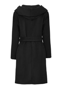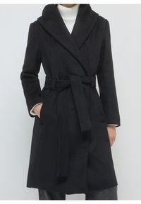 Femme portant un manteau en laine noir ceinturé avec de larges revers, par-dessus un pull à col roulé blanc, les mains dans les poches du manteau.