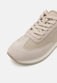 Baskets en daim beige et tissu avec une finition lisse, bout arrondi et semelle crème. Présente un logo discret sur le côté.