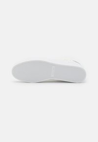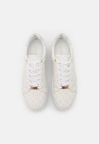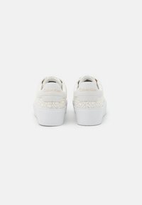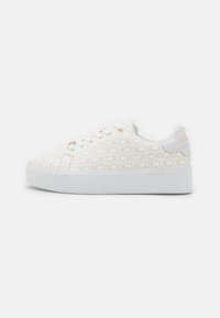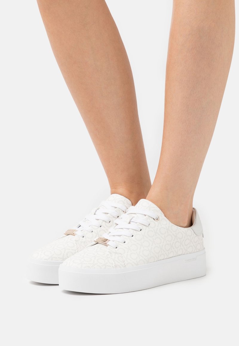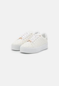 Baskets blanches à semelle plateforme, dotées d'une tige en tissu à motifs et d'accents de logo en relief. Lacées avec des lacets plats blancs.